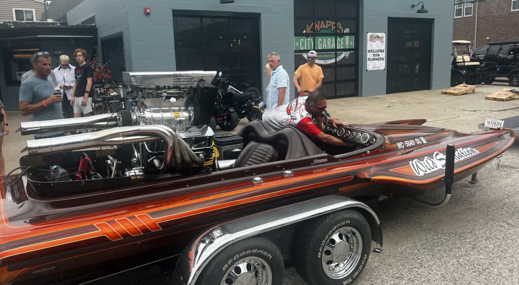 Interview over and beer in my belly, I exited Knapp’s and literally walked smack into Sunsation co-founder Wayne Schaldenbrand. Standing next next to him was engine-builder and Lake of the Ozarks Shootout legend Tyler Crockett and his wife, Kim.