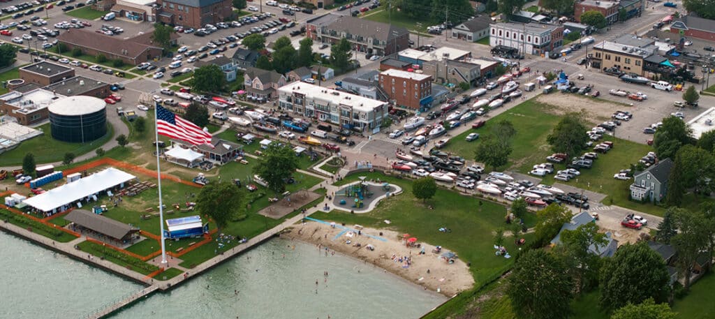 Sunsation sportboats and center consoles took over downtown New Baltimore today. Drone images by Brad DiMaggio copyright Scrapyard Media