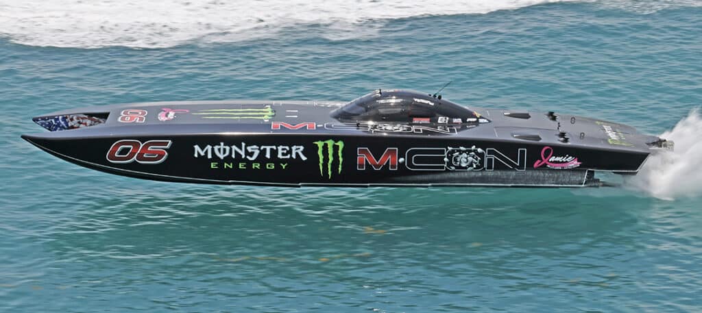 For the Monster Energy/M CON team, Sarasota presents the second opportunity to field its brand-new Skater Powerboats 438 catamaran, which was the subject of a Speedonthewater.com/Scrapyard Media-produced video. An engine issue forced throttleman/owner Tyler Miller and driver Myrick Coil to retire on the second lap.