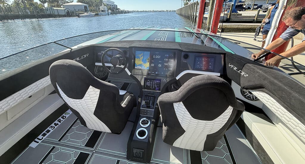 None of that was unexpected as I had ridden in the somewhat raw—the “graphics” were primer and the boat had just two temporary bucket seats—38 Valor prototype with Julian Maldonado earlier this year. But this was completed hull No. 2, and with its Ray Brasher paintjob and Prestige interior the finished product was beautiful.