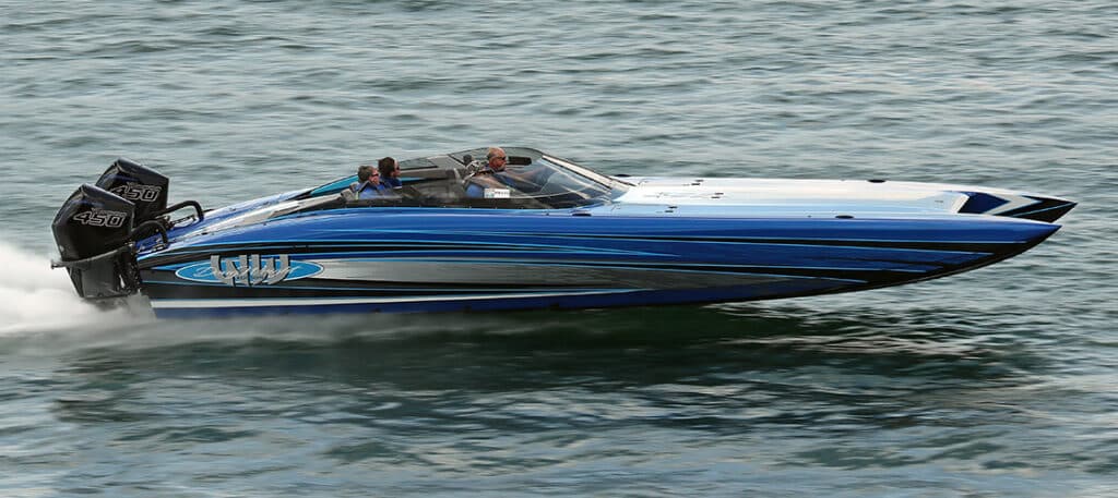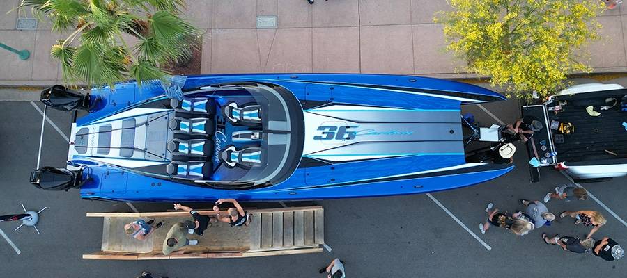 But at last Thursday’s Desert Storm Poker Run Street Party in downtown Lake Havasu City, Ariz., Wagner was simply an exhibitor. Of course, Wagner took that role as seriously as he does back home, which translated to showcasing a 36-foot Doug Wright Waves and Wheels Edition catamaran, a Skater 50SS dubbed Raiden that he and his crew completely renovated and recently sold to a West Coast customer, a 37-foot Waves and Wheels-revamped Outerlimits V-bottom and a Playcraft 366 tri-toon equipped with what he called “an insane Bluave stereo.”