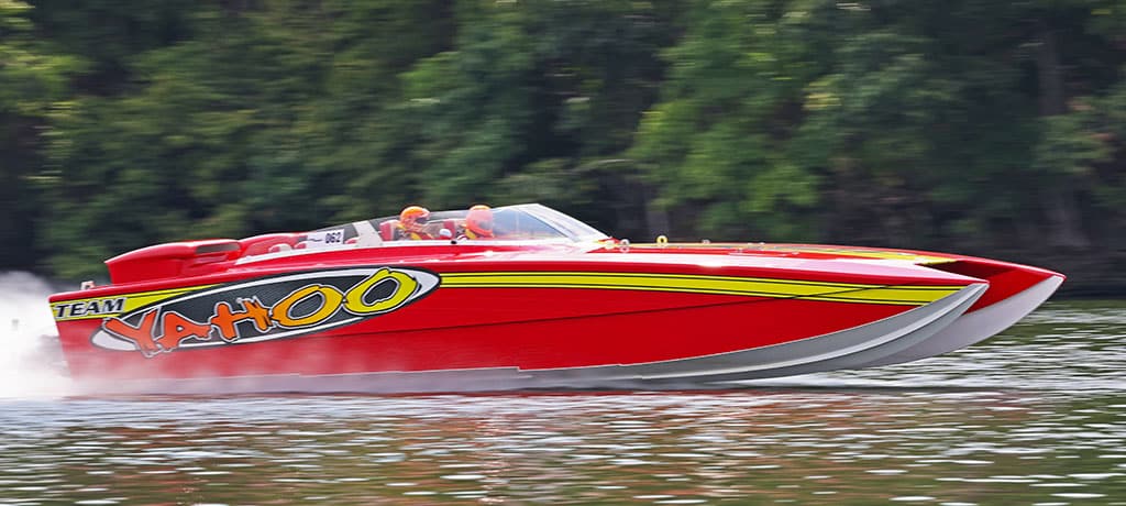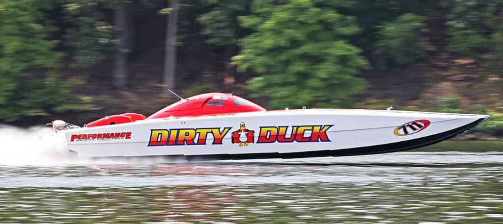 Not right on Dirty Duck’s heels, but respectable nonetheless, the Texas-based Team Yahoo Skater 368 cat owned and throttled by Curtis Morris and driven by Jamin Jones reached 185 mph to leave the team sitting in second place overall. Although he knows catching Dirty Duck is a very longshot, Jones said he believes the Skater and its twin 2,000-plus-hp Boostpower USA engines can top the 200-mph mark, and that is his goal for Sunday.