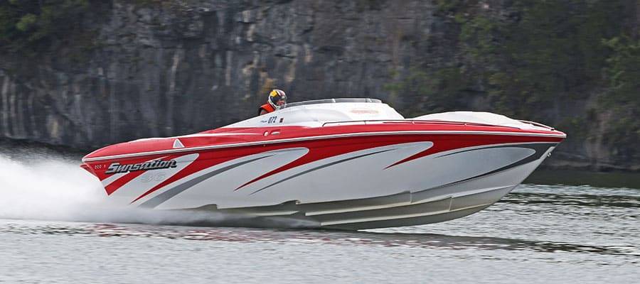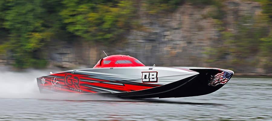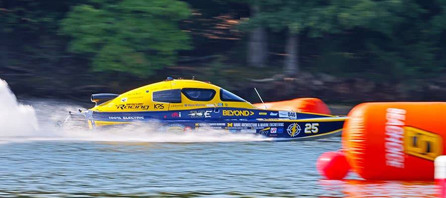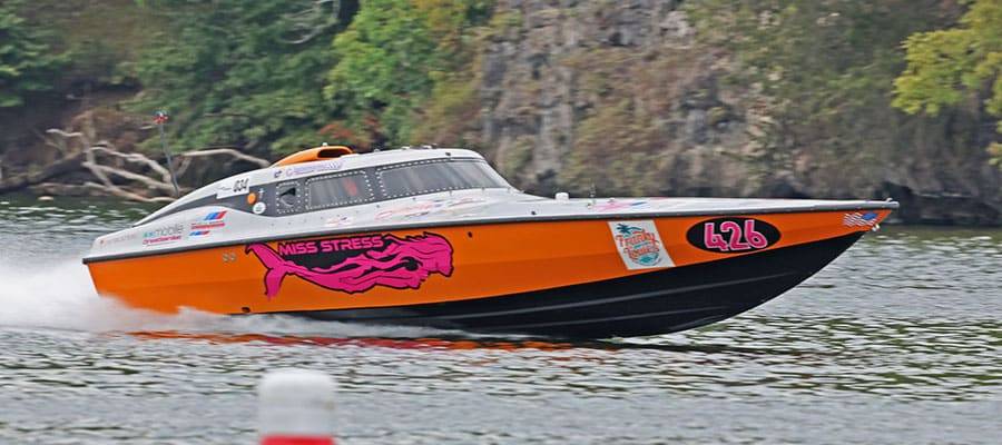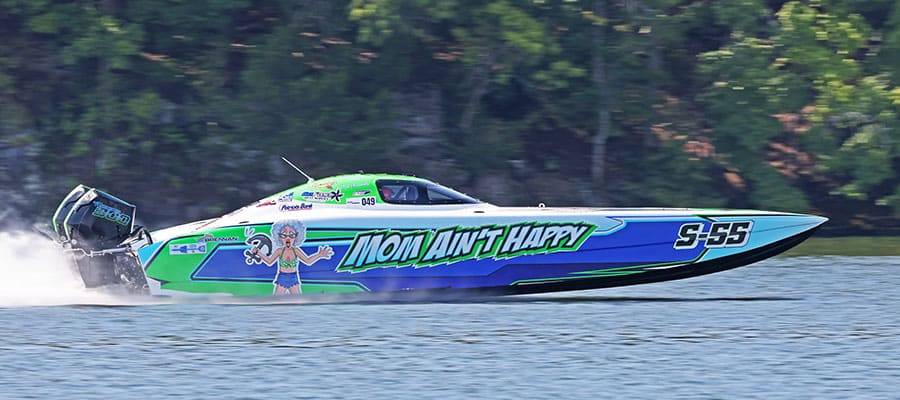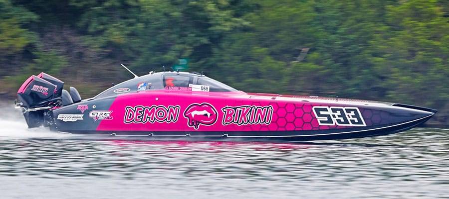 The competition was strong in the Super Stock class, which features canopied catamarans powered by twin Mercury Racing 300R engines. Between Sabrina Kowalik of Team Allen Lawn Care & Landscaping (118 mph) and Leanna Shadlow of the Demon Bikini race team (117 mph), the two females piloting the two 32-foot Doug Wright catamarans are neck and neck heading into Sunday with Ryan Williams of the Mom Ain’t Happy team not far behind after completing one pass at 110 mph in his team’s Doug Wright.
