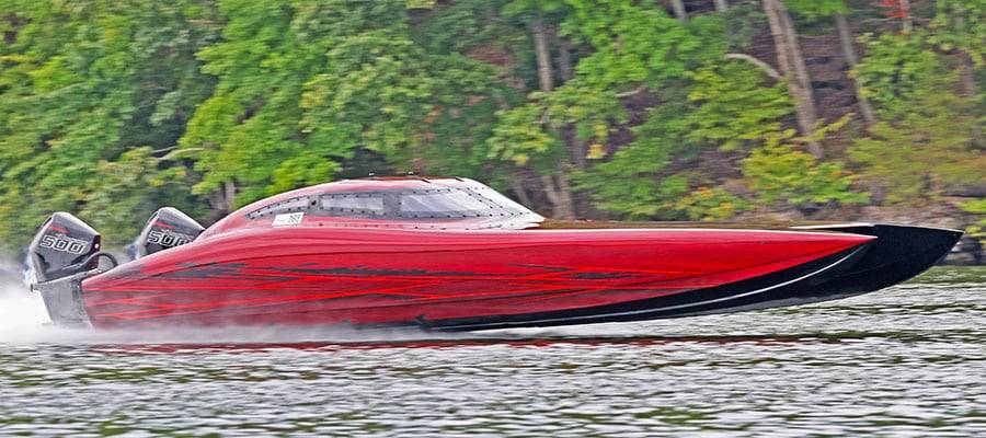Some more impressive speeds from Saturday included Phantom Boats founder Will Smith reaching 128 mph in his twin outboard-powered Phantom Speedster V-bottom, New York’s Kelly O’Hara hitting 147 mph—twice—in his canopied 40-foot MTI catamaran Holy Cow IV, Adam Carpenter of Angola, Ind., running 143 mph in his Skater 388 Pussycat, and Mitch Kramer of Maryland Offshore Performance Marine Center being clocked at 143 mph in the Voided Warranty 39 Carbon Doug Wright Powerboats cat powered by a pair of modified Mercury Racing 500R outboard engines.