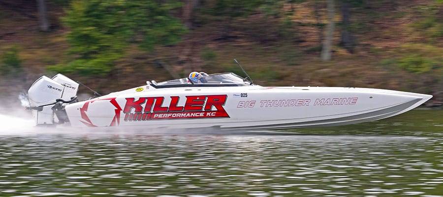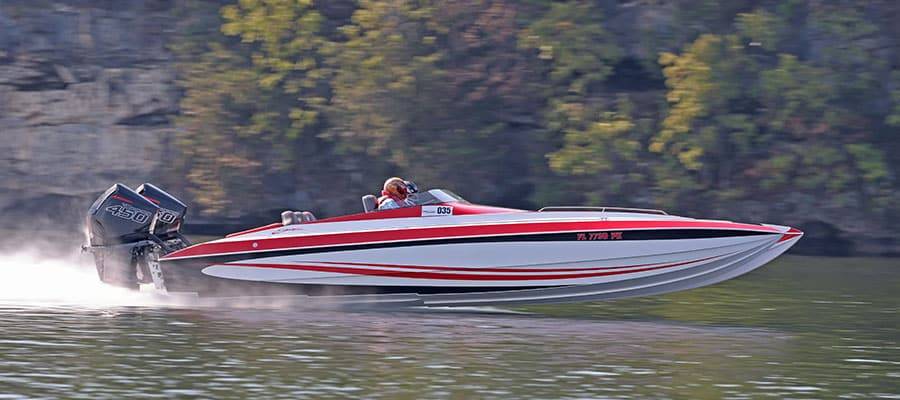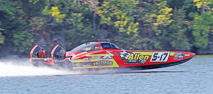 With Rusty Williams on the throttles and Adam Seraphine on the wheel, Slug Hefner’s Dirty Duck Skater was the fastest boat during the first day of competition on the new Lake of the Ozarks Shootout course. Photos by Pete Boden/Shoot 2 Thrill Pix