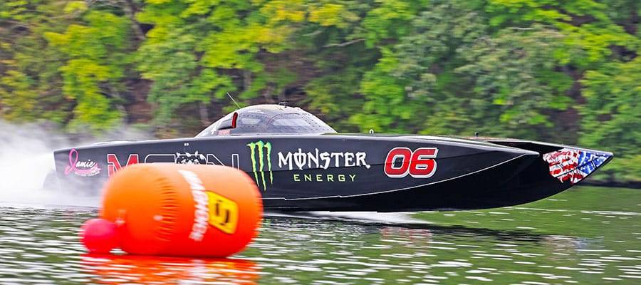 Another Hall of Famer, Performance Boat Center’s Myrick Coil, had an eventful day on the water. After driving the Monster Energy/M CON Pro Class One Skater catamaran with twin Mercury Racing 1100 engines to a top speed of 145 mph and hitting 126 mph in a new Performance Powerboats P420 cat with a pair of Mercury Racing 500R engines, Coil and owner/throttleman Tyler Miller of Kansas raced against an aerobatic stunt plane in the Monster Energy/M CON Skater to end the afternoon.