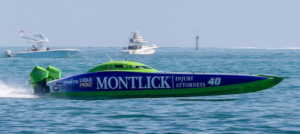 Watching the Montlick Injury Attorneys team take the Factory Stock-class checkered flag on Sunday in Key West, Fla., was among the highlights of the week for Doug Wright Powerboats/DWR company owner Justin Wagner. Photo by Jeff Helmkamp copyright Helmkamp Photos.