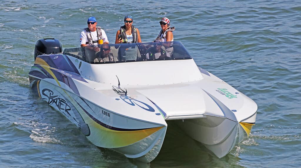 Captured here with friends in their 32-foot Skater catamaran, Tim and Cyndee Hill have their work cut out for them this season. Photos by Pete Boden copyright Shoot 2 Thrill Pix.