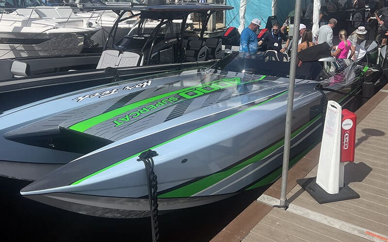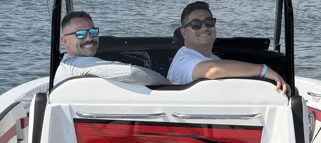 Captured here with Performance Boat Center of South Florida general manager Tommy Mason (left), Michael Hall will lead the Speed On The Water Key West Bash charity auction benefiting Samuel’s House and Samuel’s House and AHEC Health Centers. Photo from Emerald Coast Boat Week 2025 by Matt Trulio.