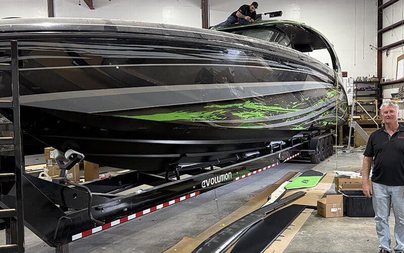 Still awaiting its final upholstery and paint, the catamaran is the property of a Michigan-based father-and-son.