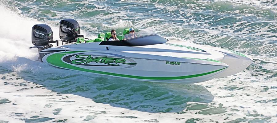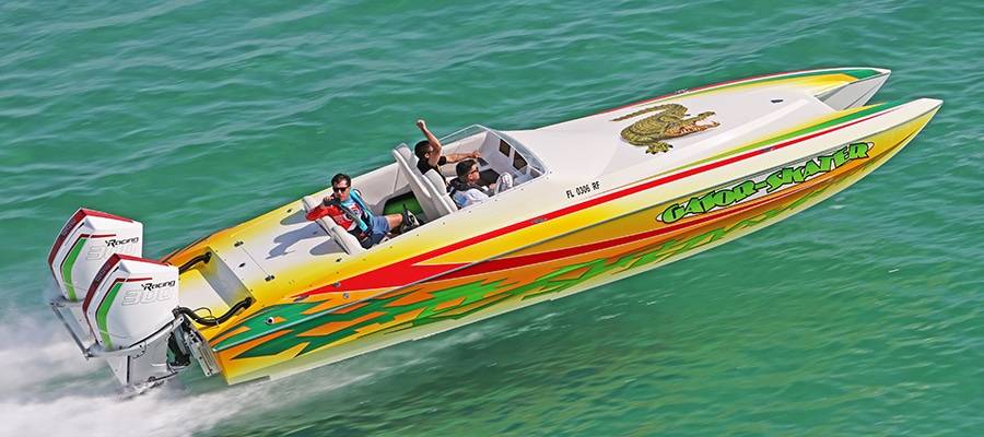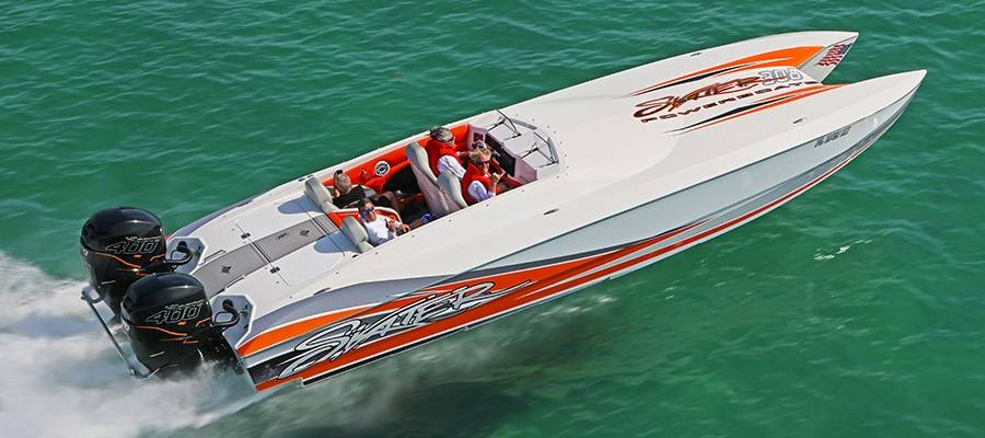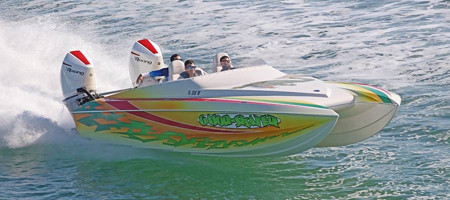 Founded by Ron Muller of Electronics Unlimited across the Sunshine State in Fort Lauderdale, the Outboard Skater Fun Run is a celebration of the company’s roots. The oldest cat in this year’s 12-boat mix was a 1993 model-year 28-footer powered by long-out-of-production Mercury Racing 300XS two-stroke outboards and owned by the father-son duo of Frank and Frankie Vetere of Long Island, N.Y. The newest was a Mercury Racing 400R-powered 308 built in 2018 and owned by Marc Halpern.