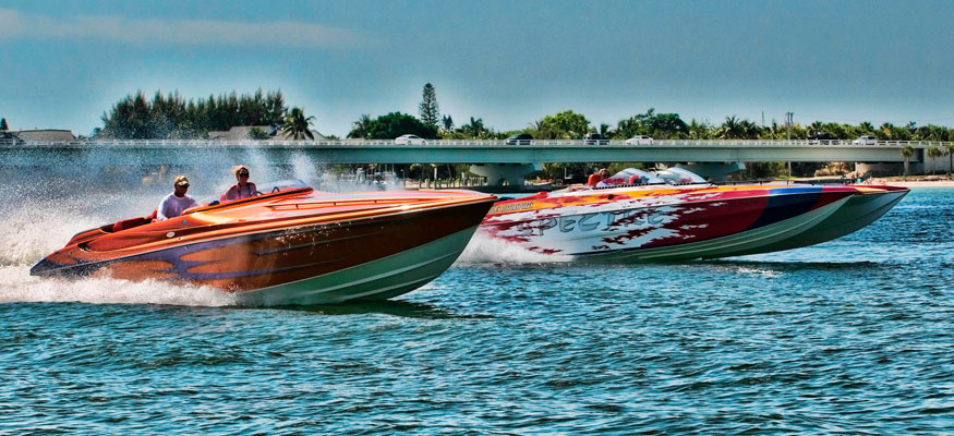 Smith (pictured at right with Eliminator Boats founder Bob Leach) said he won’t be participating in the Lake of the Ozarks Shootout—an event where he’s recorded a 180-mph top speed in his boat—this year, but he will be attending the Texas Outlaw Challenge in June with Smith’s original Predator Skater, a 40-footer built in 1991.