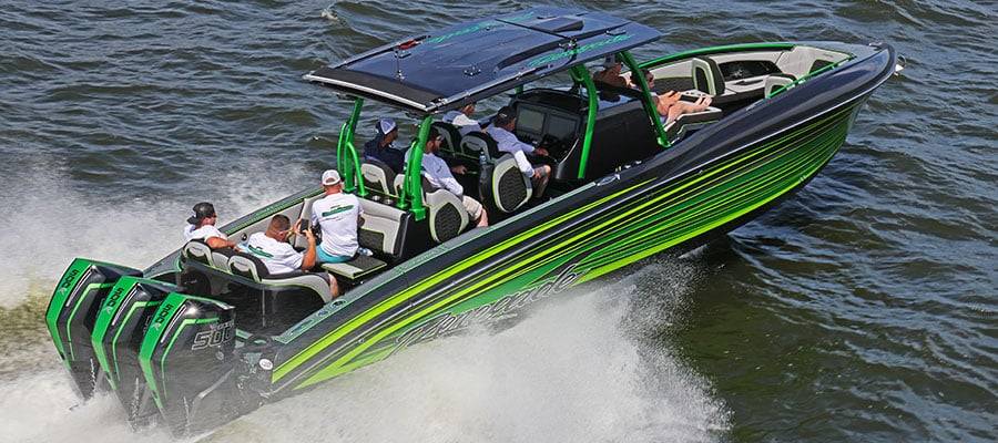 All in all, considering the family had never owned a performance center console or driven one for themselves prior to ordering the 38-footer from Kent, the Burcos do not question the decision at all. They are pleased with the boat’s performance, amenities and fit and finish. And they especially love the paintjob and its complementary colors around the primary Camaro Synergy Special Edition green that matches the Burcos’ 2011 Chevrolet musclecar and the Iridium Twilight Metallic (think dark charcoal) from a GMC pickup they own.